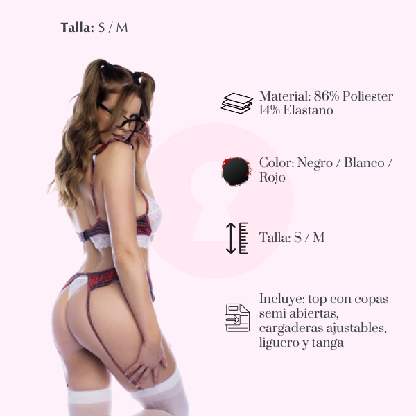 Su diseño incluye top con copas semiabiertas, cargaderas ajustables, liguero y tanga coordinada, ideal para experiencias íntimas, sesiones fotográficas o noches temáticas.