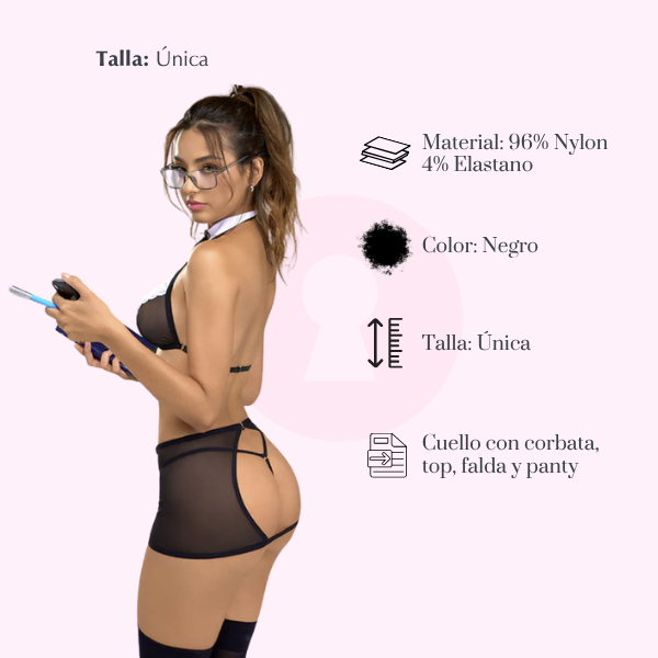 Fabricado en una mezcla de poliéster (96%) y elastano (4%), ofrece una textura suave, ligera y adaptable al cuerpo. El conjunto incluye un cuello con corbata, top de encaje, falda translúcida y panty, logrando un equilibrio perfecto entre comodidad y erotismo.