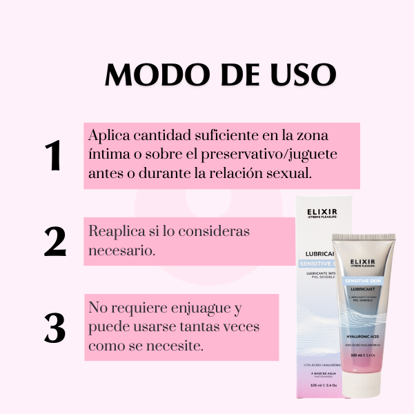 Aplica cantidad suficiente en la zona íntima o sobre el preservativo/juguete antes o durante la relación sexual. Reaplica si lo consideras necesario. No requiere enjuague y puede usarse tantas veces como se necesite.