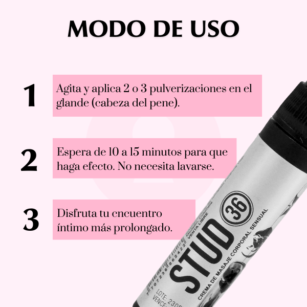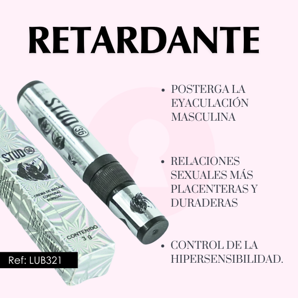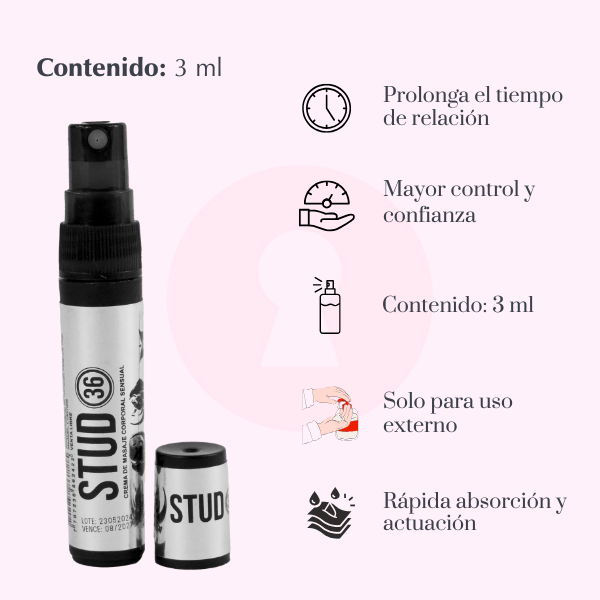 Stud 36 Plateado es un spray retardante masculino de acción local diseñado para ayudar a prolongar el tiempo de la relación íntima. Su fórmula actúa disminuyendo temporalmente la sensibilidad, favoreciendo mayor control y confianza durante el encuentro.