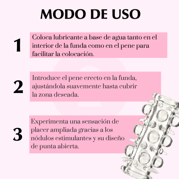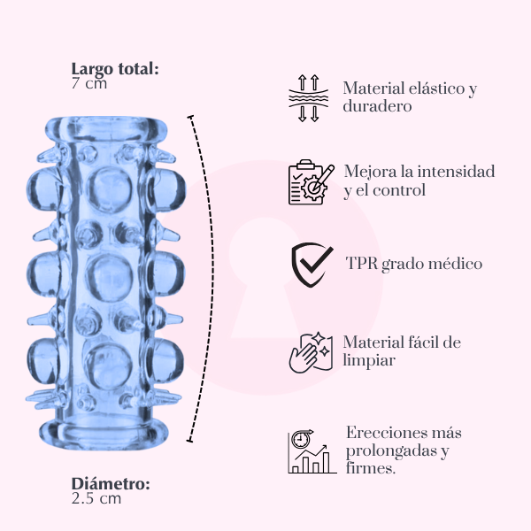 Fabricada en TPR de alta elasticidad, se adapta a cualquier grosor y ofrece un ajuste cómodo y seguro. Su textura suave y flexible hace que sea fácil de colocar, mientras que su diseño anatómico mejora la fricción, intensificando las sensaciones durante la penetración.