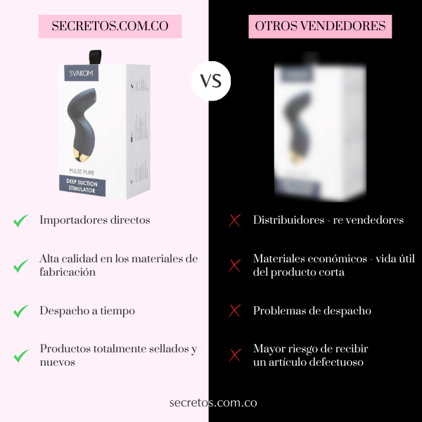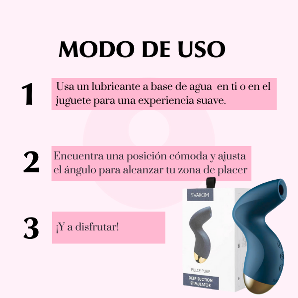 La tecnología patentada más reciente de SVAKOM se complace en mostrarte el nuevo Svakom Pulse Pure, maravilloso juguete elaborado de silicona ultra suave perfectamente diseñada para sesiones fluidas, cuenta con 5 modos de estimulación por ondas de presión, cada uno con 5 niveles de intensidad, es resistente al agua, fácil de limpiar y recargable; con la estimulación dirigida te hará experimentar el placer más profundo que jamás hayas sentido.
